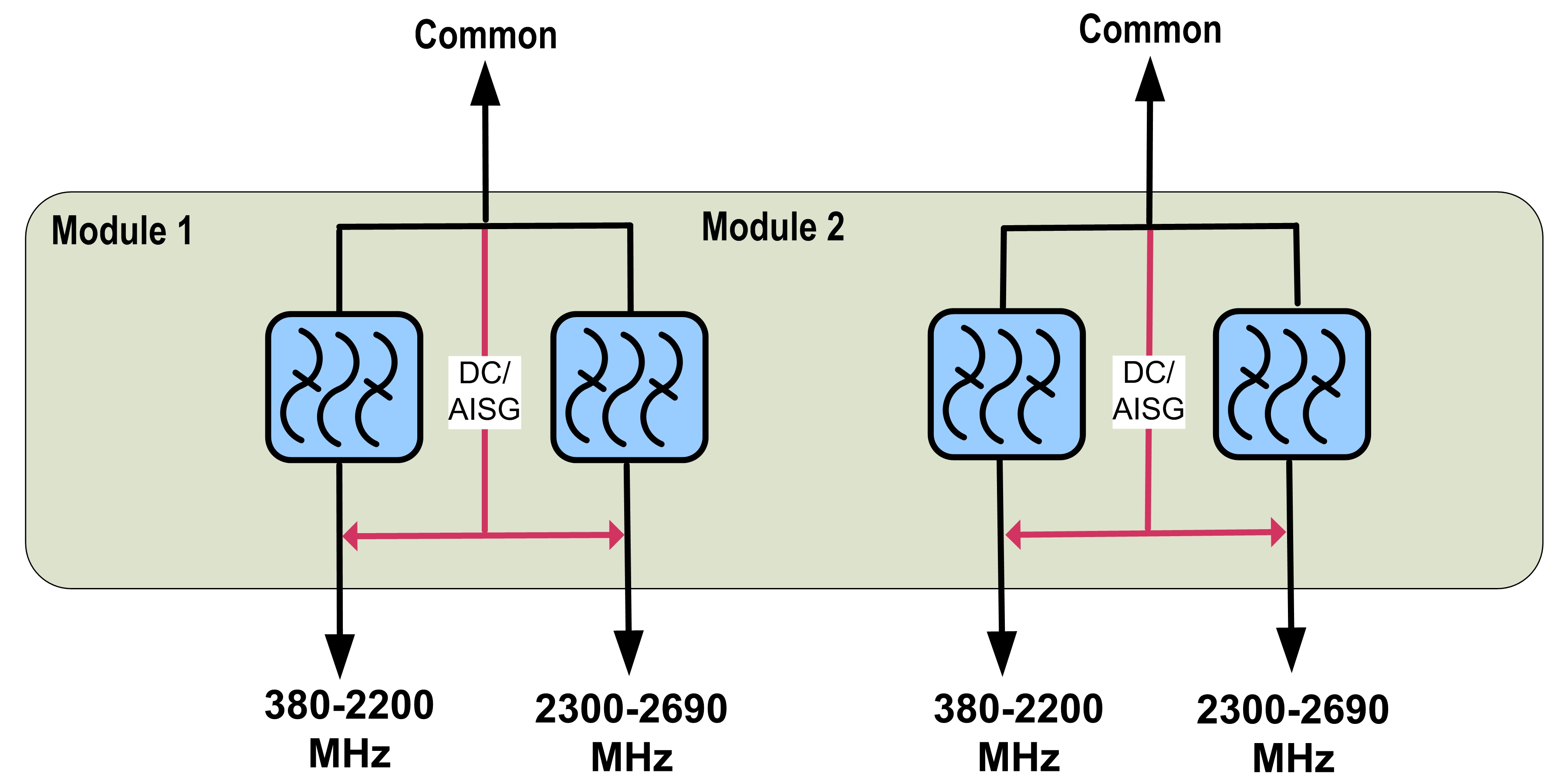 dc/AISG Pass-through, combiner dc/AISG blocking on all ports