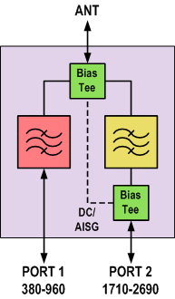 Diplexer, 380–960 MHz/1425–2690 MHz, dc pass high, with 4.3-10 connectors