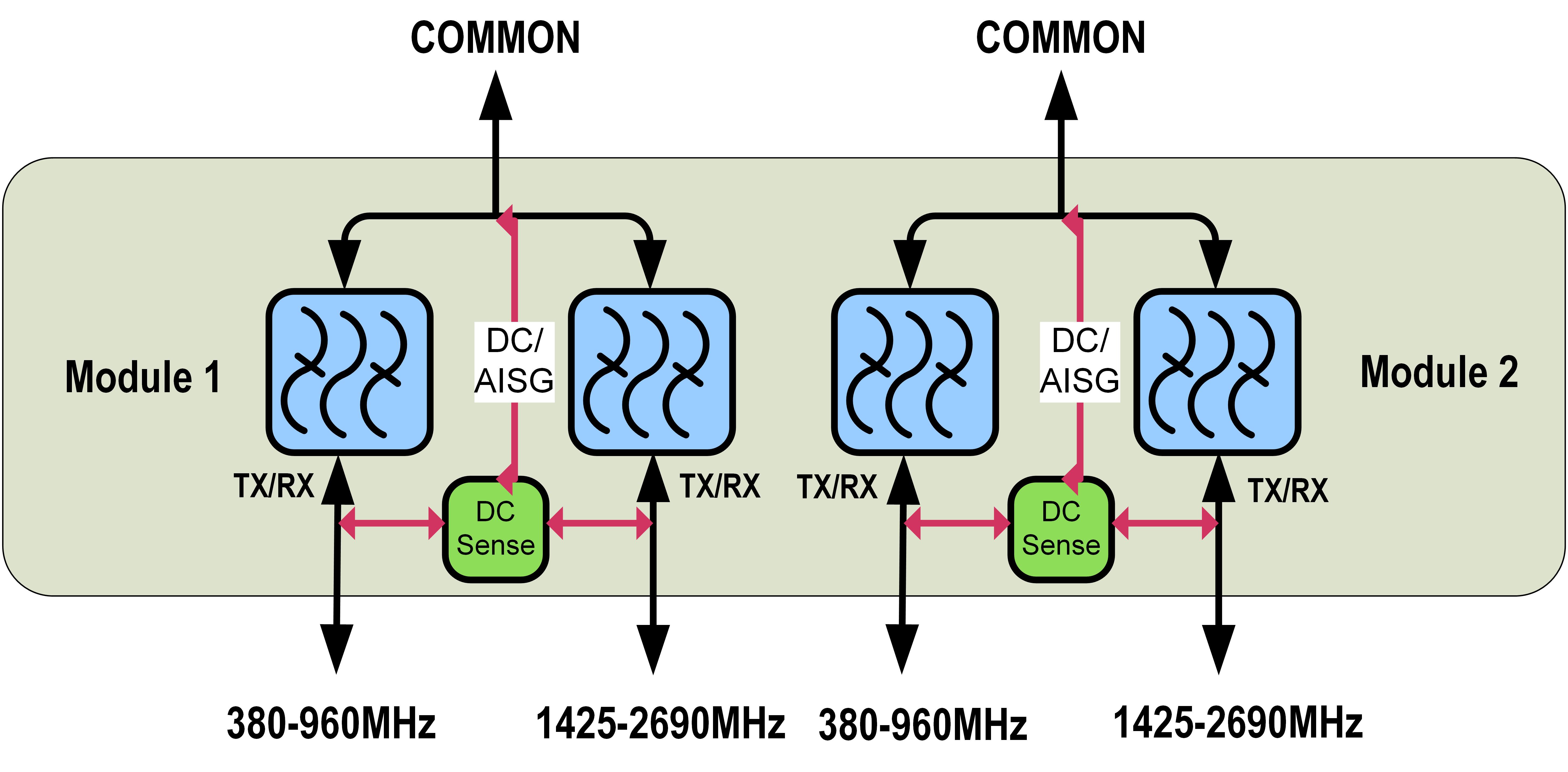 | dc/AISG Pass-through Path | Auto sensing circuitry detects dc/AISG signal presence and selects path |