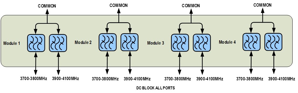 Ultra Compact Quad Diplexer, 3700–3800/3900–4100 MHz, DC Block, with 4.3-10 connectors