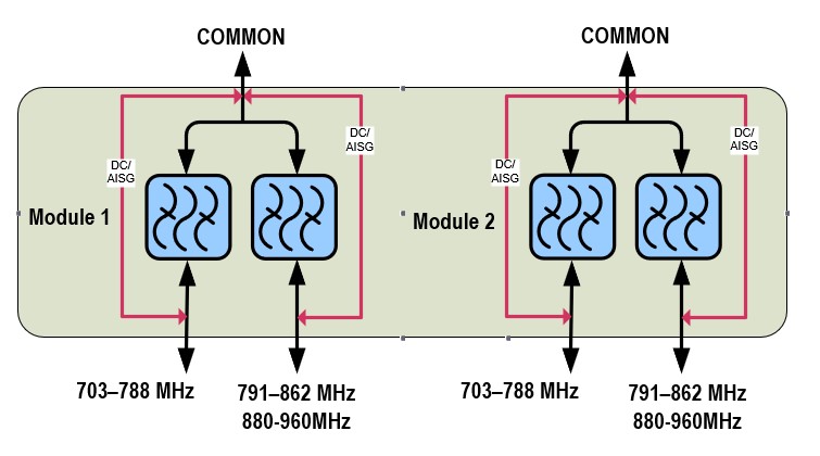 Twin Diplexer, 703-788/791-960 MHz, DC Pass on All port, 4.3-10 connectors