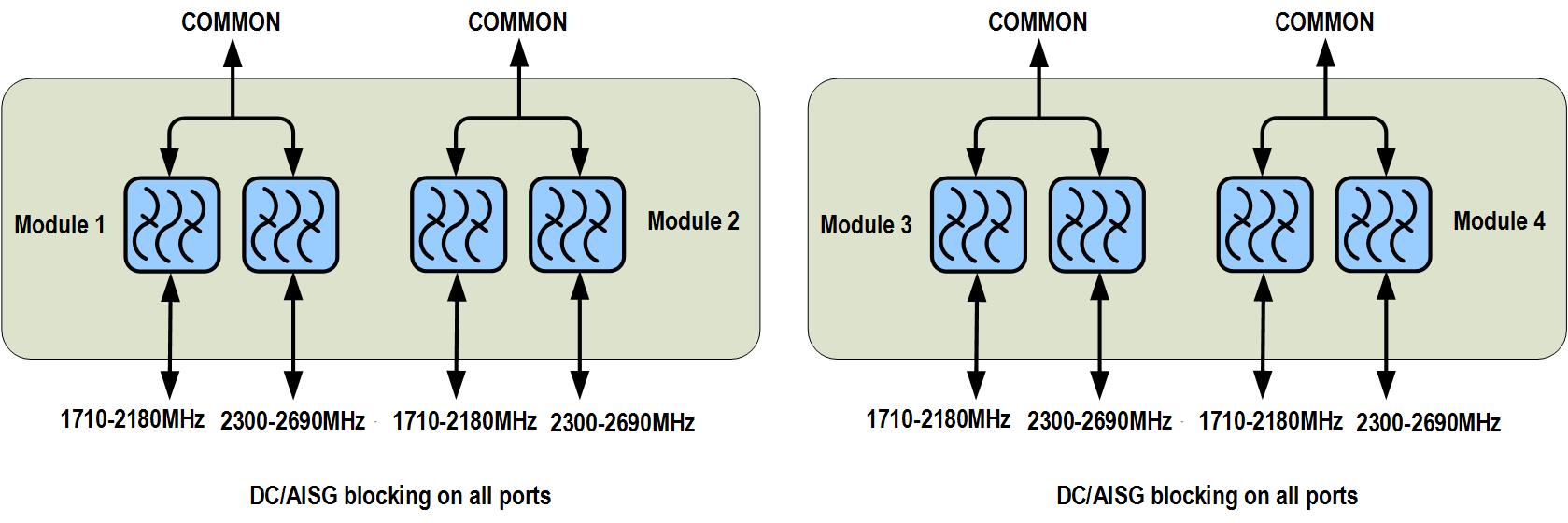 | dc/AISG Pass-through, combiner | dc/AISG blocking on all ports |
