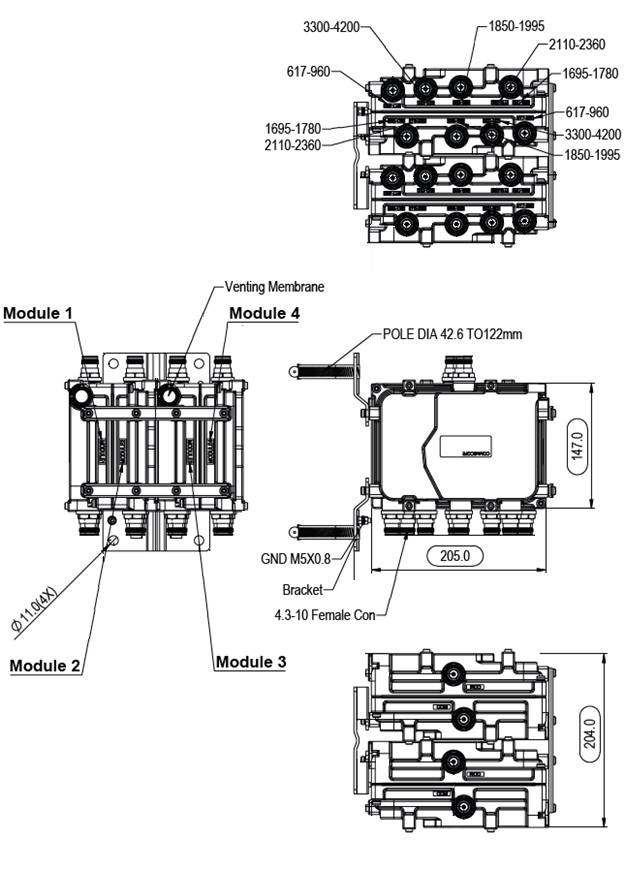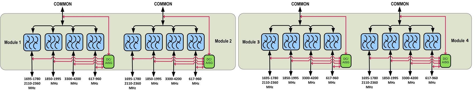 Quad Quadplexer 617-960/AWS-WCS/PCS/ CBRS-C-Band, DC Sense, 4.3-10 connectors