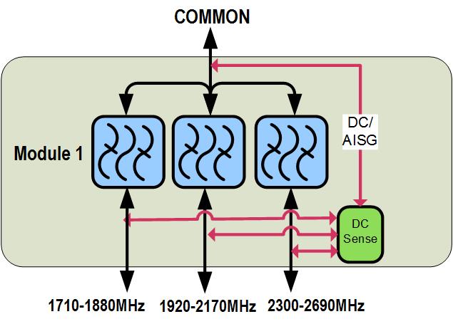 | dc/AISG Pass-through Path | Auto sensing circuitry detects dc/AISG signal presence and selects path |