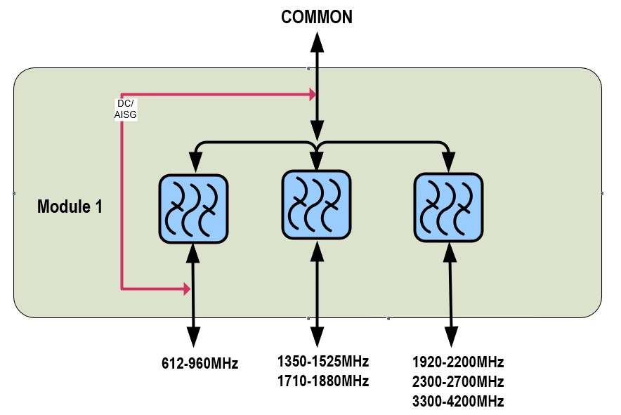 Triplexer 612-960/1400-1800/1920-4200, dc bypass on Low band port, with 4.3-10 connectors
