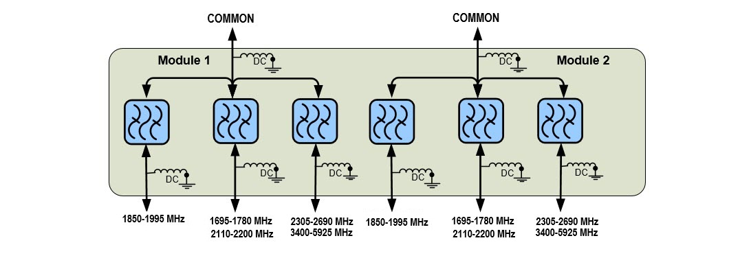 Compact Twin Triplexer PCS/AWS/2305-5925 MHz, DC blocking, 4.3-10 connectors