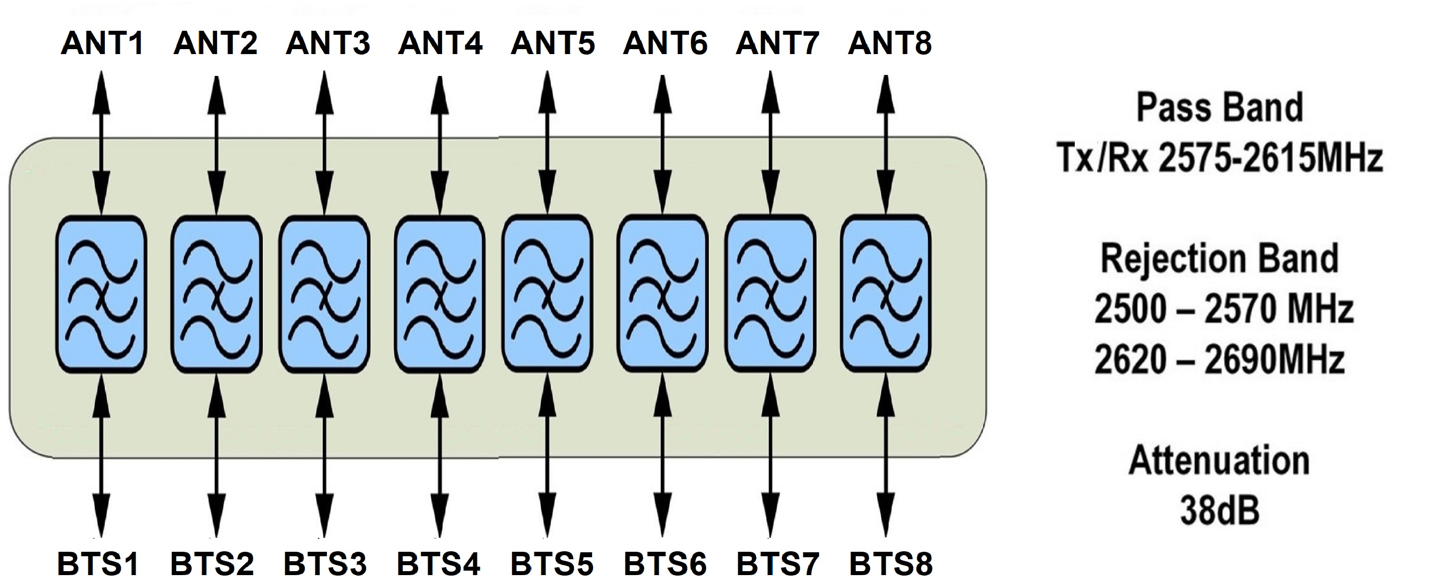 8pck IMF for 2500 MHz TDD with 38dB rejection in 2500-2570&2620-2690 MHz