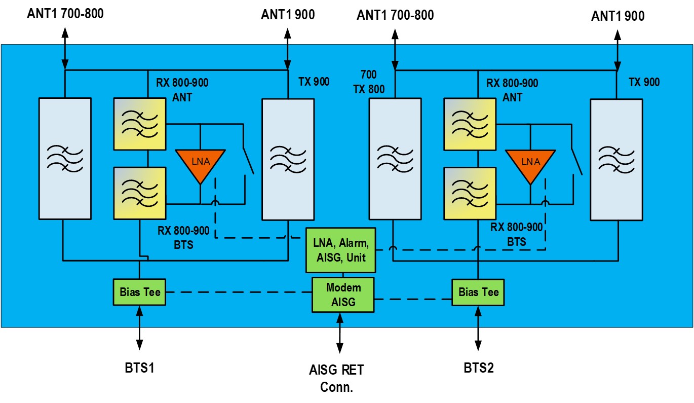 Dual Band Tower Mounted Amplifier, 800/900 MHz, 700MHz Bypass, 12 dB, 2 BTS & 4 ANT ports, AISG with 1 RET connector, with 4.3-10 connectors (1 device with 2 sub-units)