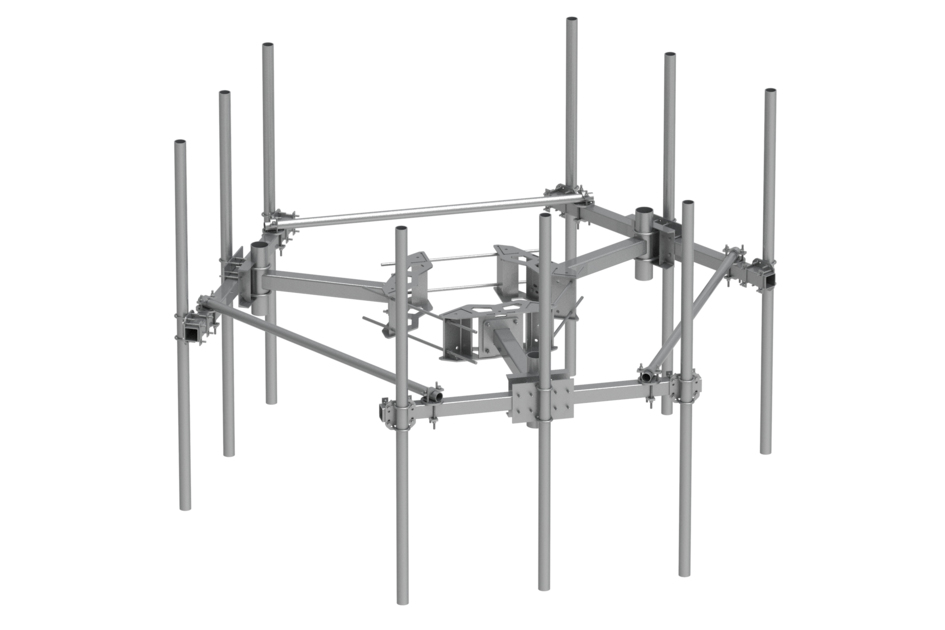 T-Arm Monopole Mount, Includes Ring Mount for 15"-50" OD Monopole, 6.5 ft face plus (9) 2-7/8" OD x 96” Antenna Pipes and Corner Tiebacks